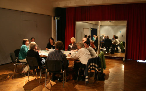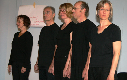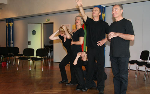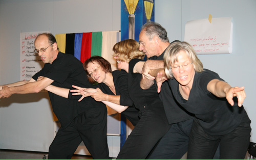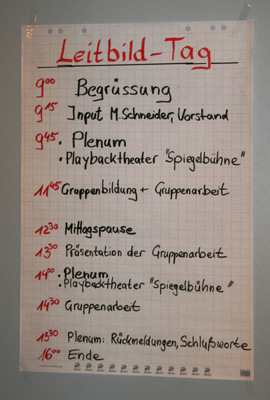 Abschließend finden Sie das Workshopdesign und einige Impressionen aus einem besonders gut gelungenen organisationsbezogenen Projekt, einem Workshop zur Erneuerung des Leitbildes mit der gesamten Belegschaft der Lebenshilfe Gießen, ca. 100 Personen, den ich mit einer Projektgruppe aus der Organisation zusammen vorbereitet und in Kooperation mit Marlies Arping und dem Frankfurter Playbacktheater „Spiegelbühne“ durchgeführt habe.